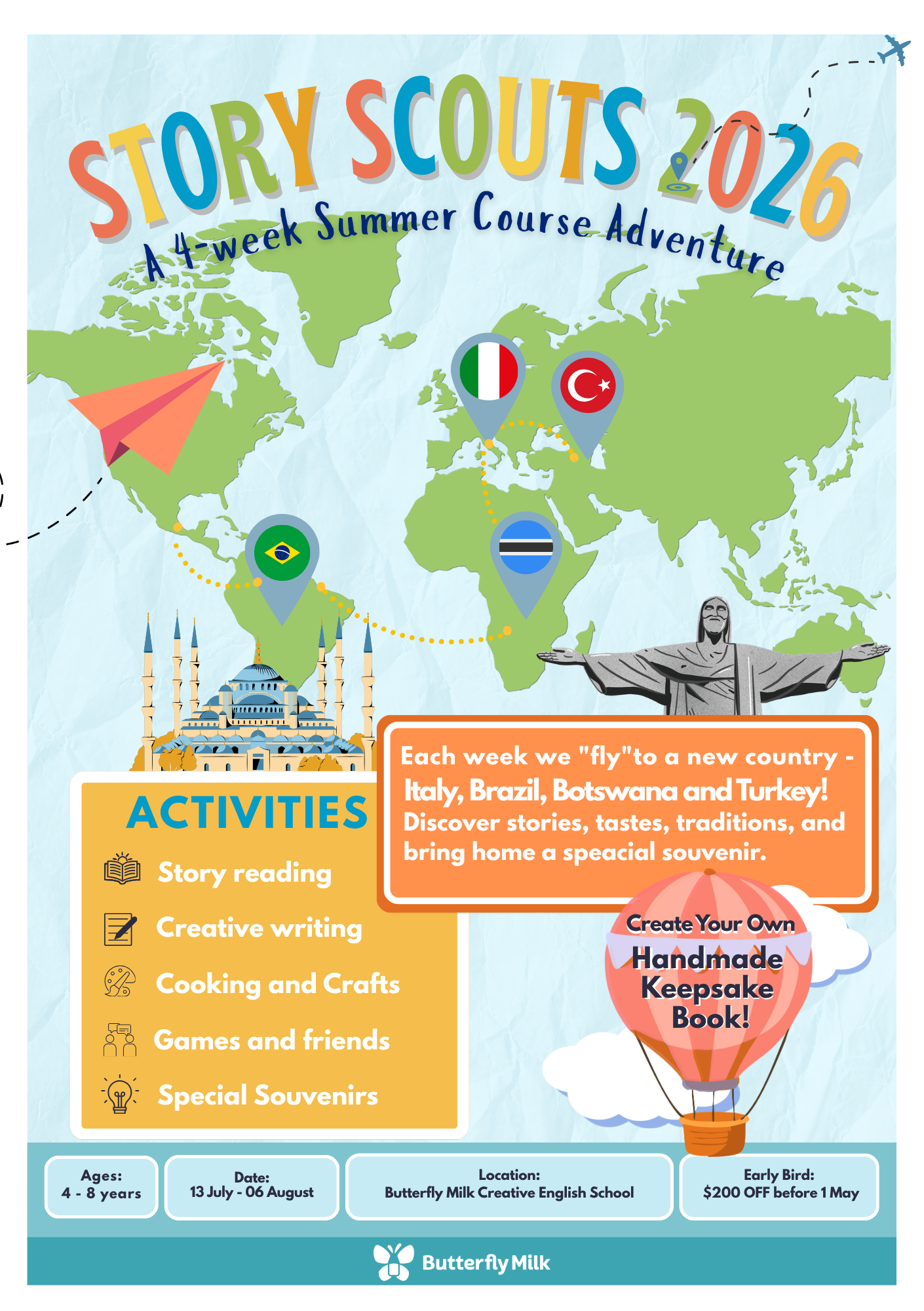 In this summer course, we will travel to four countries: Brazil, Botswana, Italy and Turkey. Taste, see, and feel the culture through cooking, crafts and books. Come explore the world and write your own scout story.